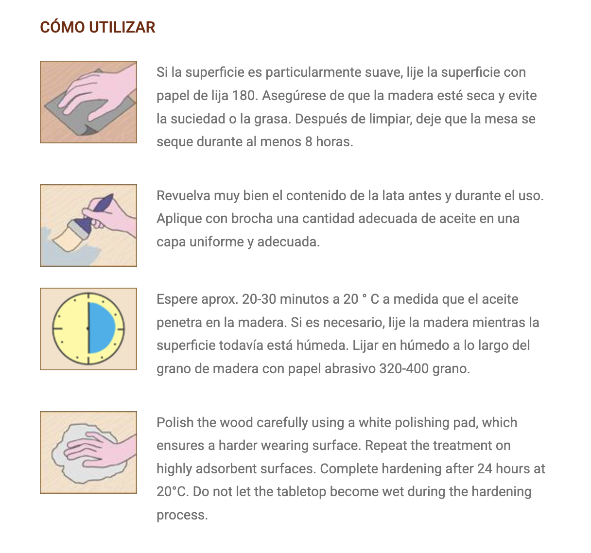 Ideal para el tratamiento de superficies de madera destinadas al contacto con alimentos como tablas de madera de cocina, platos de ensalada, etc.