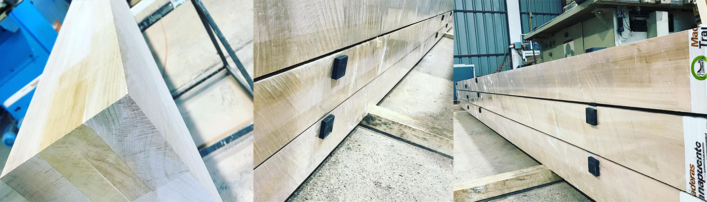 El proceso de fabricación de las vigas laminadas pasa por varias fases: secado de la madera, selección, cepillado, aplicación de colas y adhesivos, prensado, cepillado final y lijado.